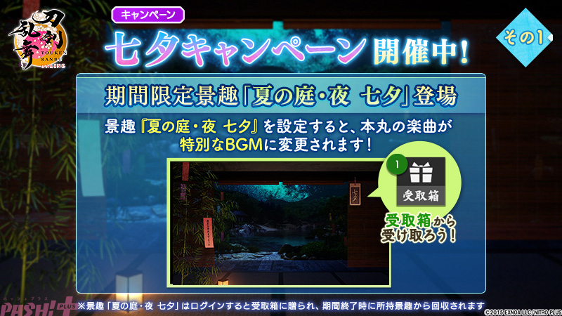 ※本キャンペーン終了後、本丸の景趣を「夏の庭・夜 七夕」に設定することや「夏の庭・夜 七夕」を所持することはできません。