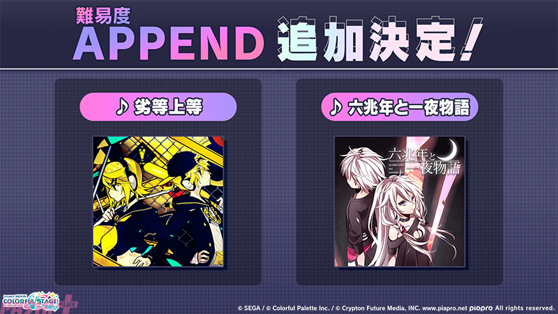 「劣等上等」(作詞:Reol、作曲:Giga)、「六兆年と一夜物語」(作詞・作曲:kemu)に、難易度「APPEND」の譜面が追加されることが決定しました。