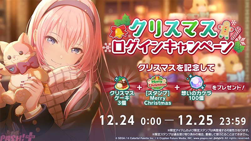 キャンペーン期間中ログインした方全員に、「クリスマスケーキ」×3個、『スタンプ「Merry Christmas」』、「想いのカケラ」×100個をプレゼントします。