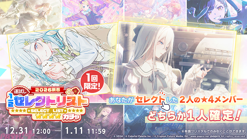 「[2026新春]運試し1/2セレクトリストガチャ」は、通常のセレクトリストガチャとは異なり、ユーザーがセレクトした2人の★4メンバーの中からどちらか1人が確定で獲得できる、お正月特別版のガチャとなります。
