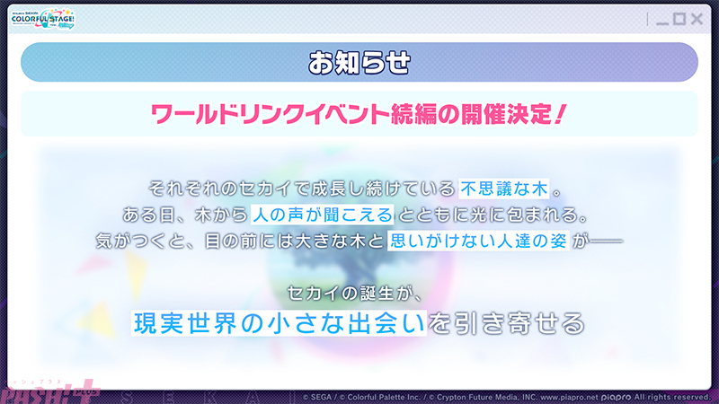 「ワールドリンクイベント」は、メンバーの“想いの変化”によりセカイの新たな“可能性”に立ち会う物語が楽しめるイベントです。通常のイベントやチアフルイベントと異なり、時間経過によってイベントストーリーが解放され、イベントをサポートする「サポートユニット」が登場するなどの特別なイベントとなっています。
