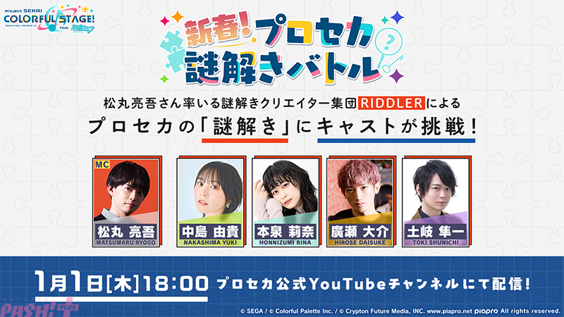 プロセカ公式YouTubeチャンネルにて、松丸亮吾さん率いる謎解きクリエイター集団「RIDDLER」が手掛ける『プロジェクトセカイ』の謎解きに、日野森志歩役の中島由貴さん、日野森雫役の本泉莉奈さん、天馬司役の廣瀬大介さん、神代類役の土岐隼一さんが挑戦する番組「新春! プロセカ謎解きバトル」の配信が決定しました。お正月はぜひ『プロジェクトセカイ』の謎解きをお楽しみください!
