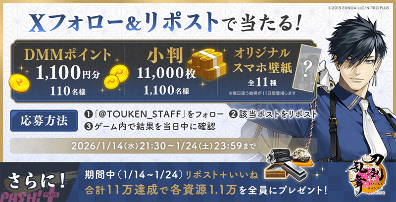 公式Xでは、11周年記念Xキャンペーンを開催します。運営アカウントをフォロー&毎日0時に運営アカウントから投稿される該当ポストをRP&当日中にゲーム内で結果を確認していただいた方の中から抽選で1,100円分のDMMポイントを期間中合計110名、小判11,000枚を期間中合計1,100名にプレゼントします。