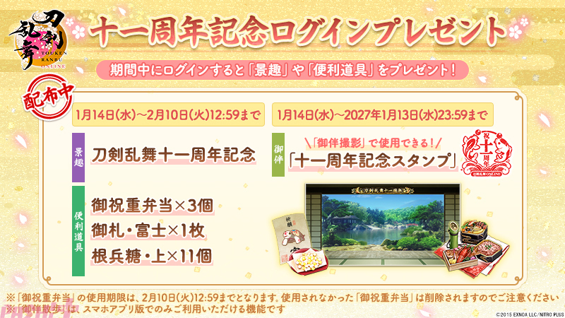 期間中、ゲームにログインした全ての方を対象に、景趣「刀剣乱舞十一周年記念」や便利道具などをプレゼントします。さらに「御伴撮影」で使用できる「十一周年記念スタンプ」のプレゼントも実施します。
