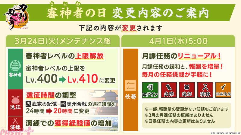 2026年3月24日(火)のメンテナンス後より、審神者レベルの上限を「Lv.400」から「Lv.410」へ変更しました。さらに遠征時間と演練の獲得経験値を調整しました。また、2026年4月1日(水)5:00に、月課任務のリニューアルを実施予定です。