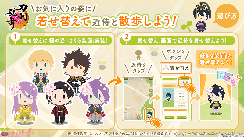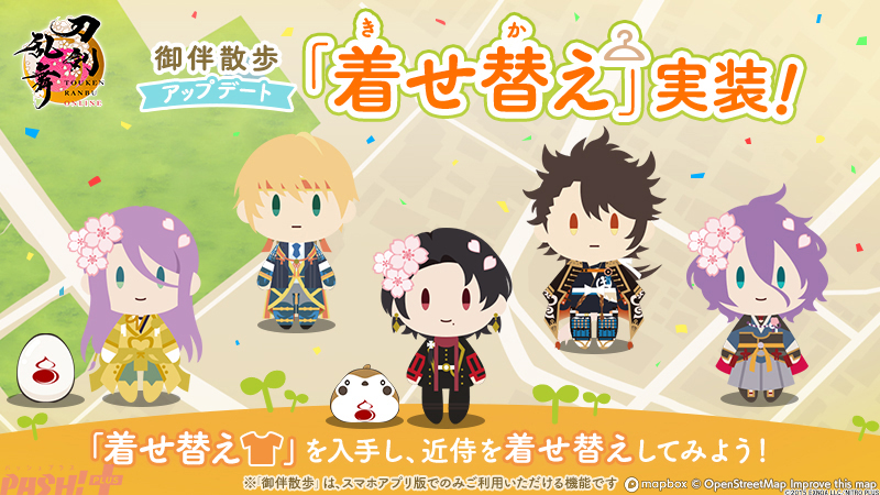 2026年3月24日(火)のメンテナンスにて、スマホアプリ版のみでご利用いただける「御伴散歩」機能のアップデートを実施し、「着せ替え」機能を実装しました。近侍を「極の姿」や「さくら装備」に着せ替えることができます。