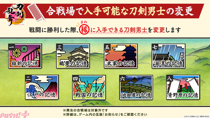 また過去合戦場の通常のマスやボスマス、検非違使で戦闘に勝利した際、まれに入手できる刀剣男士が変更されました。