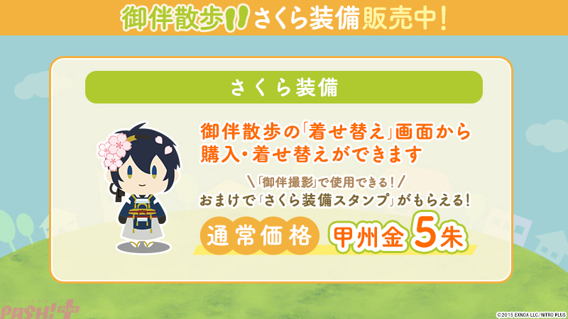 なお「さくら装備」は「着せ替え」画面で販売中です。購入いただくと「御伴撮影」で使用できる「さくら装備スタンプ」がおまけでついてきます。