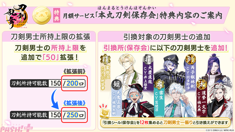 月額サービス「本丸刀剣保存会」の刀剣男士所持上限が「50」拡張されました。また引換所(保存会)に引換対象の刀剣男士が6振り追加されました。