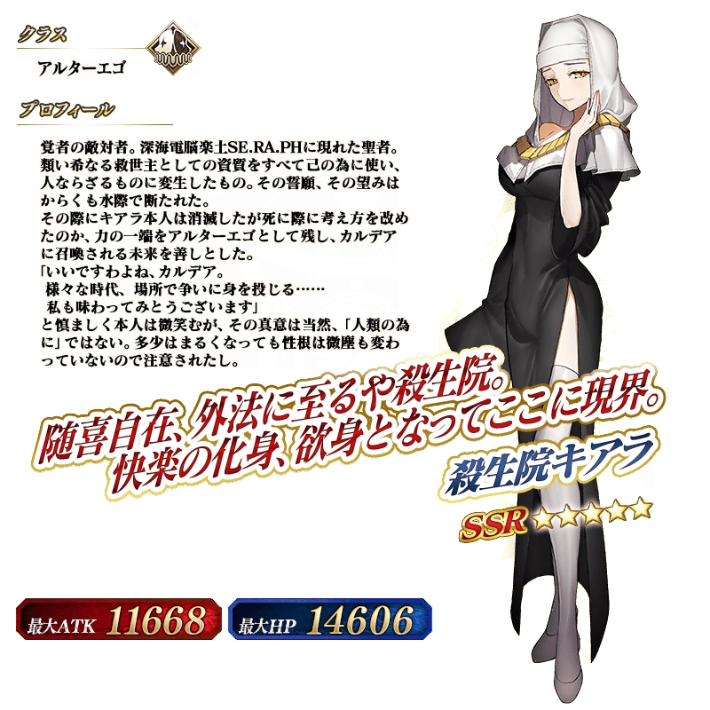 ※殺生院キアラは、ピックアップ期間終了後、ストーリー召喚には追加されない。