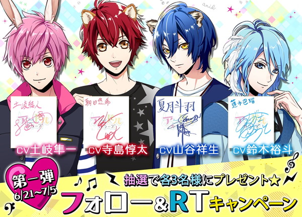 事前登録者数3万人突破を記念して、公式Twitterでのリツイートキャンペーンも開始に。指定ツイートをリツイートした人の中から抽選で、寺島惇太さん、山谷祥生さん、鈴木裕斗さん、土岐隼一さんの直筆サイン色紙が各3名、合計12名にプレゼントされる。