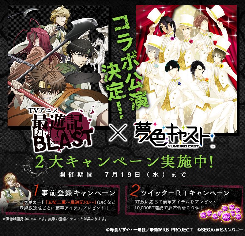 コラボでは、TVアニメ『最遊記 RELOAD BLAST』の登場キャラクター“玄奘三蔵”たちが『夢色キャスト』に登場する。