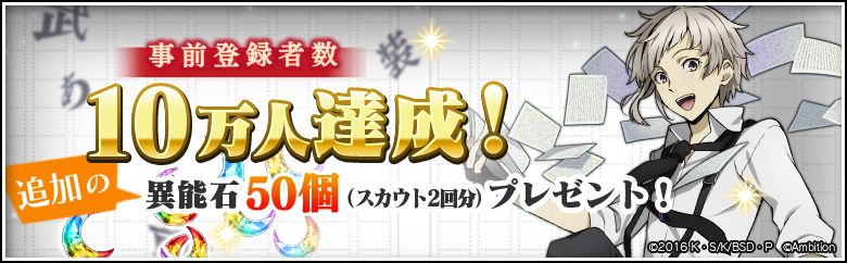 事前登録キャンペーン10万人達成の特典として、ゲームリリース時にすべてのユーザーに“異能石×100”、“スカウトチケット×1”、“SRスカウトチケット×1”、“SR中島敦(ボイス付き)×1”がプレゼントされる。