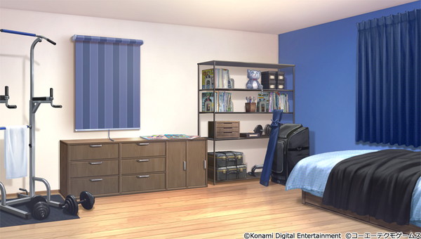 トレーニンググッズがたくさんある不破の部屋。棚にはモデルの仕事関連の雑誌があり、中には少し古いものも。猫グッズはこの部屋をリビングにしてる『彼』が持ち込んだものかも。