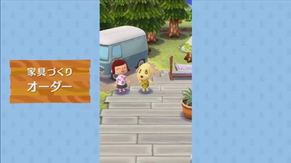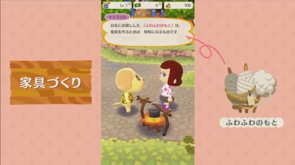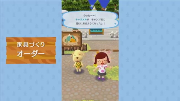 最初はガランとしたキャンプ場は、さまざまな家具を飾ることでたくさんのどうぶつたちが遊びきてくれるようになるとのこと。どうぶつの“おねがい”を解決するとお礼がもらえる。お礼の中には、家具作りに必要な素材も。職人に依頼することで、家具を作ってもらえるようだ。