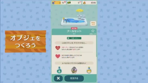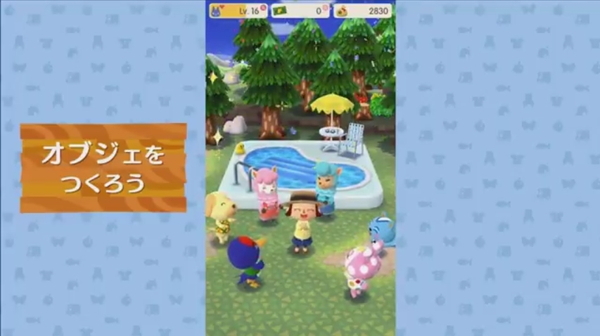 家具だけでなく、大きなオブジェも作れるようだ。建造には数十時間かかることもあるが、“リーフチケット”というものを使用するとすぐに完成させられる。このリーフチケットは、時間短縮や便利なアイテムの入手に利用可能。リーフチケットは“しずえチャレンジ”と呼ばれるさまざまなお題をクリアすることで手に入れられるとのこと。また、課金によって購入することもできる。