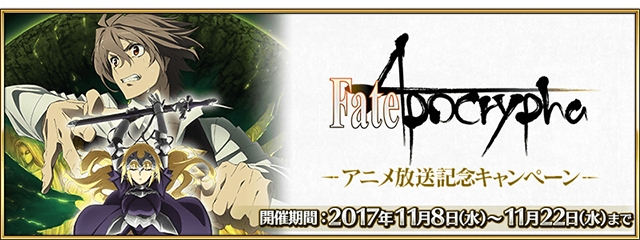 iOS/Android用アプリ『Fate/Grand Order(FGO)』でTVアニメ『Fate/Apocrypha』の2ndクール放送を記念した“Fate/Apocryphaアニメ放送記念キャンペーン”が、11月8日18:00(予定)~22日(水)12:59の期間実施される。