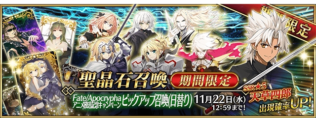 期間中は“★5(SSR)天草四郎”が期間限定で登場するほか、“★5(SSR)モードレッド(セイバー)”“★5(SSR)カルナ”、“★5(SSR)ジャック・ザ・リッパー”、“★5(SSR)ヴラド三世(バーサーカー)”、“★5(SSR)ジャンヌ・ダルク(ルーラー)”が日替りでピックアップされ、“★4(SR)アストルフォ”が常時ピックアップされるなど、テレビアニメ『Fate/Apocrypha』で活躍する対象サーヴァントの出現確率がアップされる。