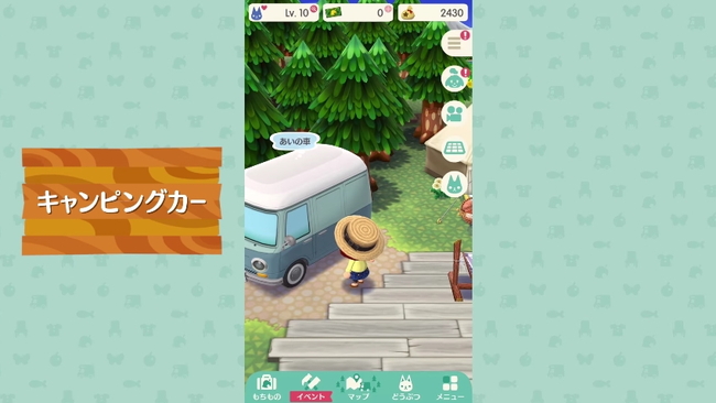 『どうぶつの森 ポケットキャンプ』は、これまでの家の要素が“キャンピングカー”になります。家具を置いてインテリアを楽しめるほか、キャンピングカーの外装を変えることもできます。キャンピングカーのカスタマイズは何段階かに分かれているようで、ゲーム内通貨・ベルを使えば2段にすることも可能なよう。