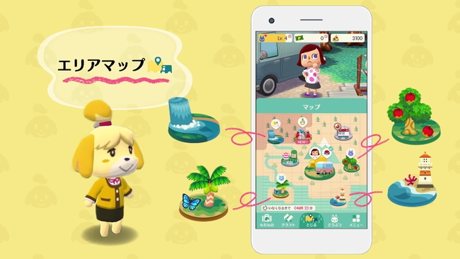 『どうぶつの森 ポケットキャンプ』では、鉱石掘りができる“ゴロゴロ鉱山”やリゾートらしい島“ポッカリ島”、日替わりでショップが出店する“こもれび広場”、いろいろな果物が実る“ワサワサの森”など、自然を感じられるスポットが数多く登場します。