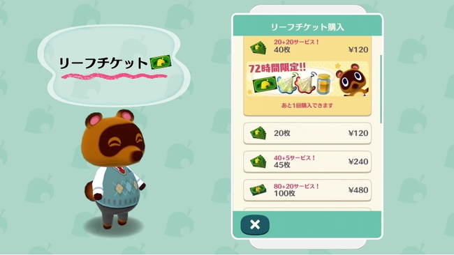 『どうぶつの森』の魅力として、“好きなときに好きなように村での生活を楽しめる”ことがあるので、あまり急いでゲームを進める必要もありませんが、仮にリーフチケットを80+20枚=100枚買っても500円以内という安心の設定なので、適度に利用するのも手かもしれません。