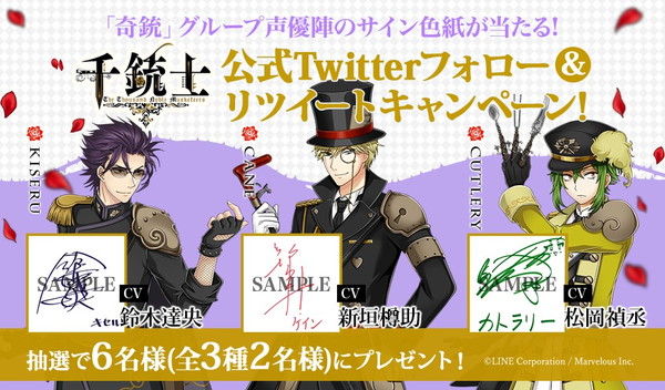 キャンペーン期間中に、『千銃士』公式Twitter アカウント(@senjyushi_game)をフォローし、 キャンペーンの対象ツイートをリツイートした人の中から、抽選で合計6名(全3種、各2名)に、‟奇銃”グループのキャラクターとして出演の声優陣、鈴木達央さん、新垣樽助さん、松岡禎丞さんのサイン色紙が当たるキャンペーンが実施される。