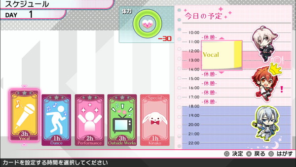 歌やダンスのレッスンに、各地での営業など大忙しのアイドル達。上手くスケジュールを組み立ててアイドルたちをマネジメントしよう。