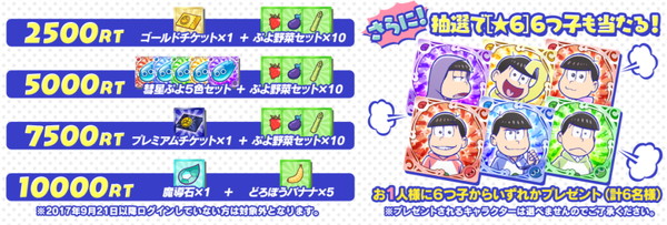 10,000RT達成で“魔導石”のほか、“ぷよ野菜セット”や“どろぼうバナナ”などをプレゼント。さらに、抽選で6名におそ松たち6つ子のいずれか1体がプレゼントされる。