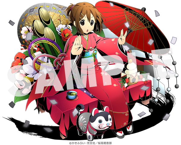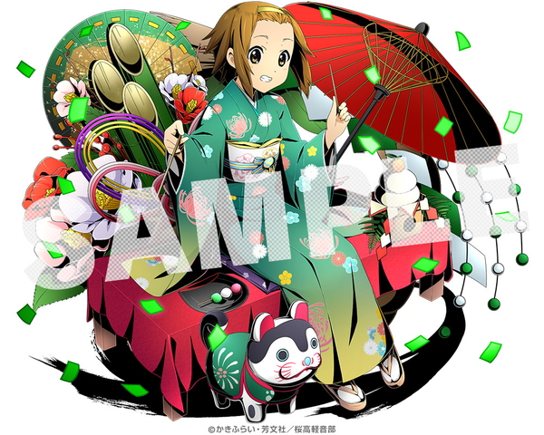『けいおん!』のキャラクターのみが的中する2種類のコラボスクラッチが登場します。最初に登場するのは、“放課後ティータイム”のメンバー5人と軽音部顧問の“山中さわ子”などの、『けいおん!』を彩るキャラクターたちに、平沢 唯、秋山 澪、田井中 律の3人の振袖姿がラインナップされた“コラボスクラッチPart1”。