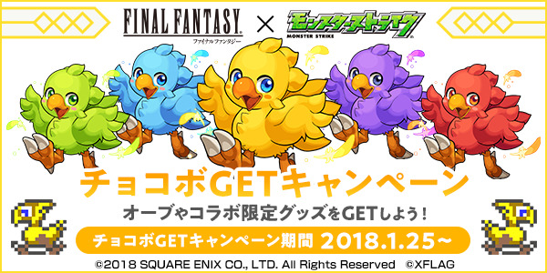 本キャンペーンでは、1月25日から抽選でコラボオリジナルグッズが当たるチャンスや、コラボ特設サイト上にて楽しめるコラボ限定BGMなどのコンテンツの公開が予定されている。また、1月30日より、モンストアプリにログインすると、コラボキャラクター“チョコボ”がもらえる。