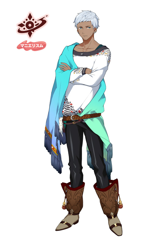 褐色の肌に銀色の短髪、ターコイズブルーの瞳が彼のアイデンティティー。爽やかな寒色系の服装もよく映えています。体つきはガッシリしたタイプ。サインの文字は故郷の言葉でしょうか?