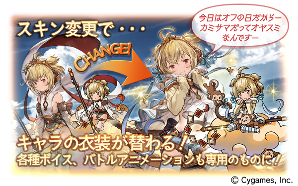 2月28日12:00より“アンチラスキンセット”が登場。“レジェンド10連ガチャチケット”1枚と“キャラ専用スキン”1種類のセットが、3,000モバコイン、3,000グラブルコイン、3,000GREEコイン、または3,000DMMポイントで購入できる。ひとり1回のみの販売だ。
