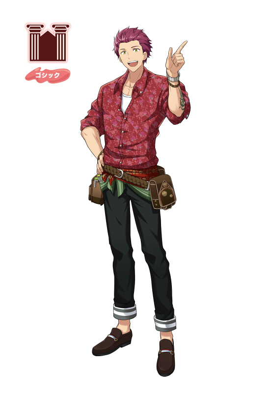 赤紫の髪に近い色合いのシャツを着るのがいつものファッション。その襟元から覗く体は、かなり鍛え上げられている印象です。パレット美術館のなかでも、相当体格が良いタイプなのではないでしょうか。