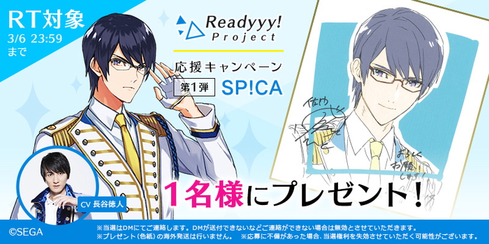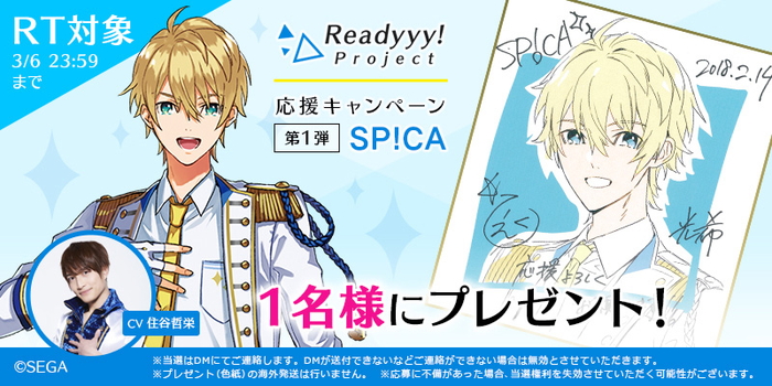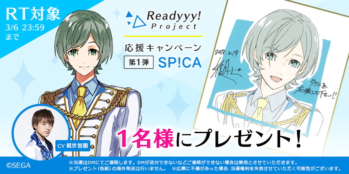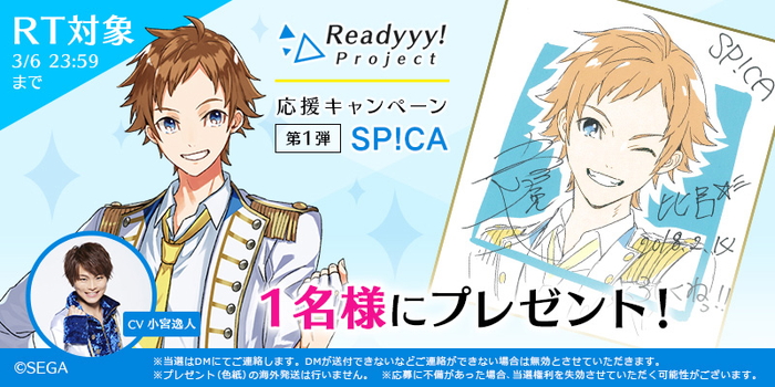 本キャンペーンでは、『Readyyy!』プロジェクト公式Twitterをフォローし、希望する賞品の該当ツイートをリツイートした人の中から抽選で各1名に、キャライラストにキャストのサインが入った色紙がプレゼントされる。