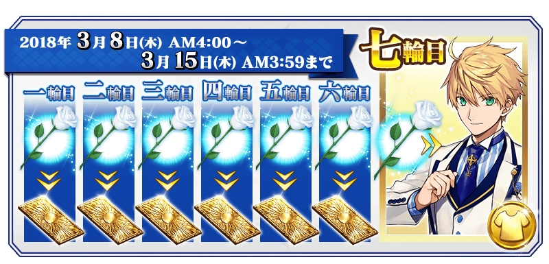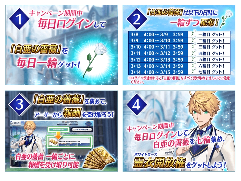 キャンペーン期間中にログインすると、毎日“白亜の薔薇”が一輪もらえる。毎日一輪ずつ集めて順番に報酬を受け取ると、七輪目の交換で“アーサー・ペンドラゴン〔プロトタイプ〕”の霊衣開放権を獲得できる。
