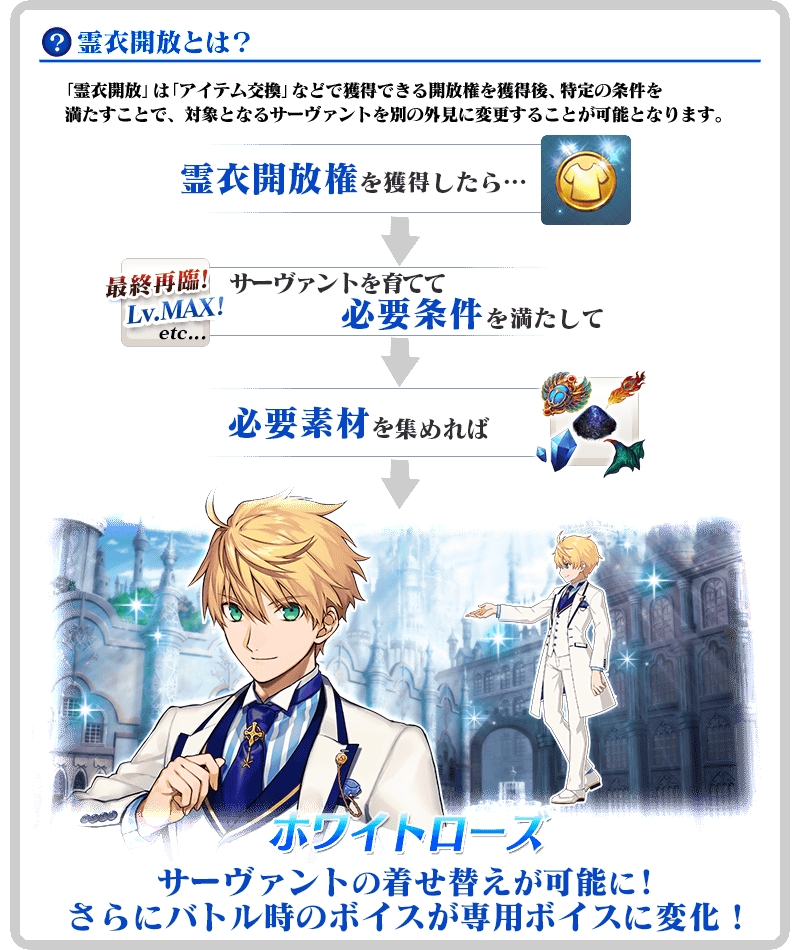 ※“白亜の薔薇”と報酬の交換時に聴くことのできる“アーサー・ペンドラゴン〔プロトタイプ〕”の特別なボイスは、キャンペーン期間終了後、サーヴァント詳細の“ボイスリスト”に追加される。