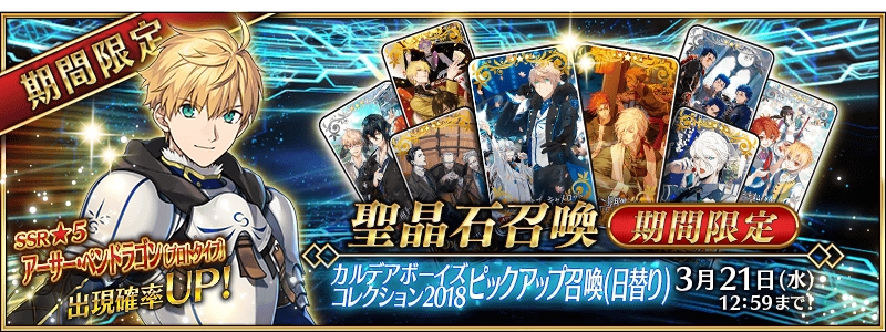 3月7日メンテナンス終了後~21日12:59の期間開催される“カルデアボーイズコレクション2018ピックアップ召喚(日替り)”では、章の進行により追加されるサーヴァントを含む男性サーヴァントが日替わりでピックアップされる。また、“★5(SSR)アーサー・ペンドラゴン〔プロトタイプ〕”は常時ピックアップ!