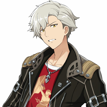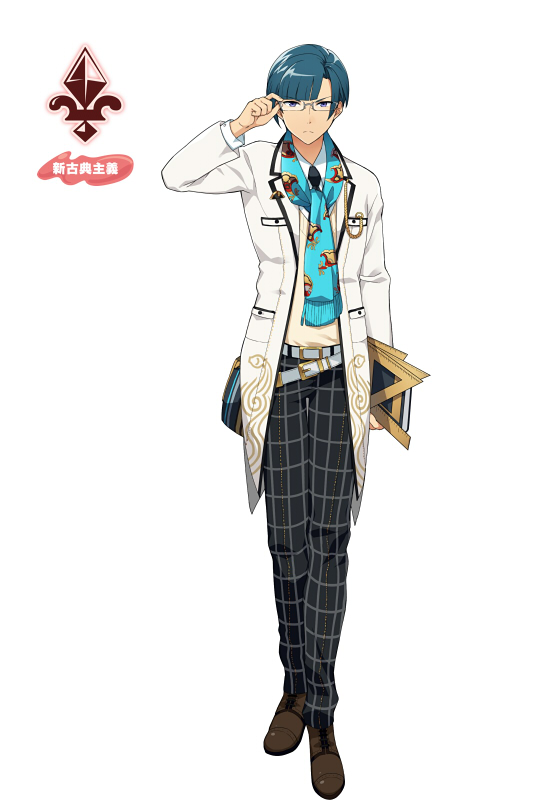 群青色の髪は綺麗に切りそろえられた前髪が特徴的。メガネも彼のトレードマークのひとつです。ジャケットの造りは正確さを表すかのごとくシンメトリー。ひときわ鮮やかなスカーフが目を惹きますね。