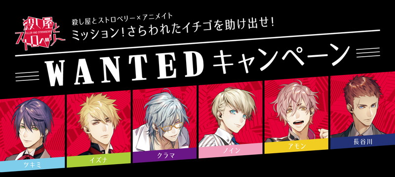 3月24日からアニメイト全店を6つの地域に分け、6キャラクターそれぞれのWANTEDポスターが掲示される。ポスターに書かれたクイズを6つのチームごとに“殺し屋とストロベリー×アニメイト WANTEDキャンペーン特設ページ”に設置された回答フォームから答えを入力する。(正解者が出ても4月13日16時59分まで回答を入力することができる。)