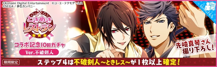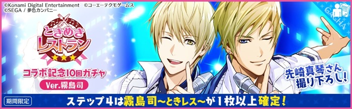 『ときめきレストラン☆☆☆』×『夢色キャスト』コラボ記念10回ガチャでは、4ステップ目に、“Ver.霧島 司”では“霧島司~ときレス~”、“Ver.不破剣人”では“不破剣人~ときレス~”が1枚以上確定で出現する。