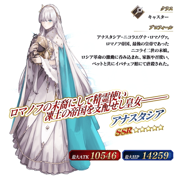 4月4日18:00(予定)~18日12:59の期間“アナスタシアピックアップ召喚”が開催される。第2部 第1章“Lostbelt No.1 永久凍土帝国 アナスタシア 獣国の皇女”で活躍するサーヴァント“★5(SSR)アナスタシア”、“★4(SR)アタランテ〔オルタ〕”、“★3(R)アヴィケブロン”が新登場。上記、3騎のサーヴァントがピックアップされる。
