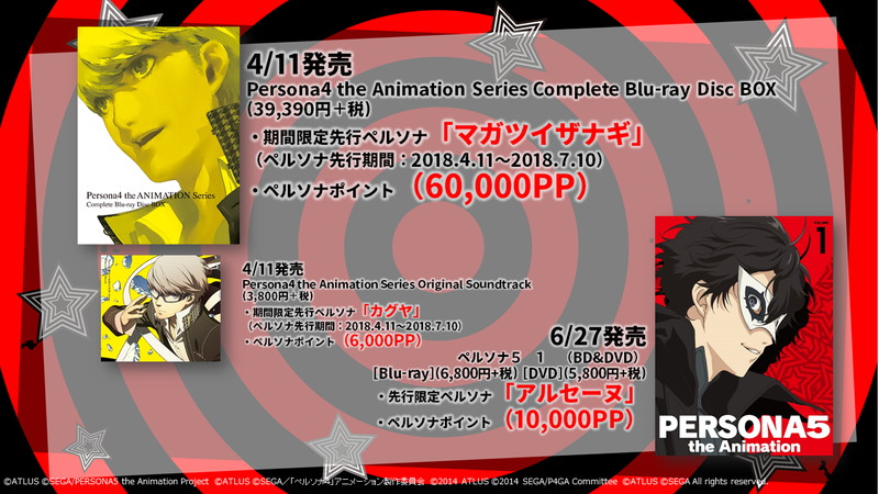 探索機能他で貯めたペルソナポイントはイベント・抽選施策の応募、ペルソナ召喚等に使用できる。4月11日発売のTVアニメ『ペルソナ4』シリーズBDBOX・サントラ、6月27日発売のTVアニメ『ペルソナ5』 BD&DVDにもペルソナポイントや限定先行ペルソナが付いてくるのでこちらも確認しよう。