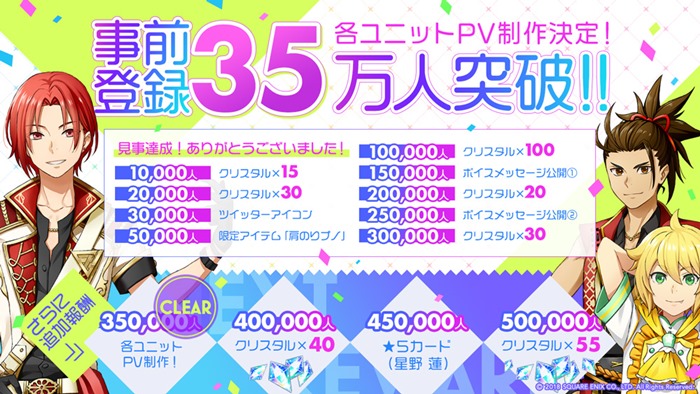 35万人達成を祝して、全ユーザーに“クリスタル累計195個(145個でガチャ10連)”がアプリ配信時に配布される。“キャラクターボイスメッセージ(一言メッセージ1、2)”については、詳細が後日、公式サイトもしくは公式Twitterにて告知される。