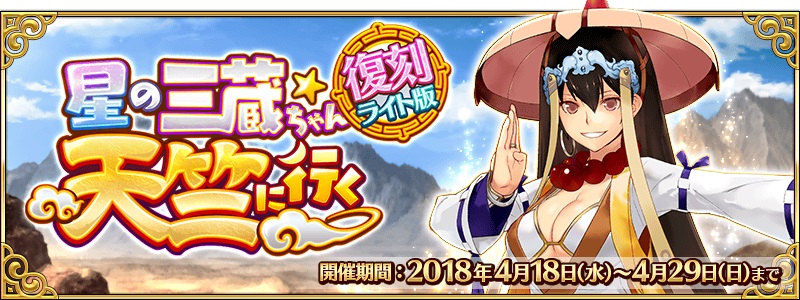 4月18日(水)18:00(予定)から4月29日(日)12:59 までの期間限定で、2016 年に開催した“星の三蔵ちゃん、天竺に行くピックアップ召喚”の内容を一部変更した、“復刻 星の三蔵ちゃん、天竺に行くピックアップ召喚(日替り)”が開催される。