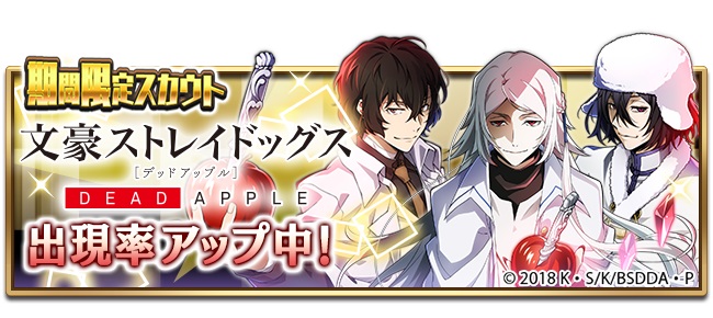 iOS/Android用アプリ『文豪ストレイドッグス 迷ヰ犬怪奇譚』にて、映画『文豪ストレイドッグス DEAD APPLE(デッドアップル)』のキャラクターが期間限定で登場する“映画『文豪ストレイドッグス DEAD APPLE』スカウト”が5月8日(火)13:59まで開催されている。