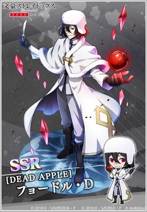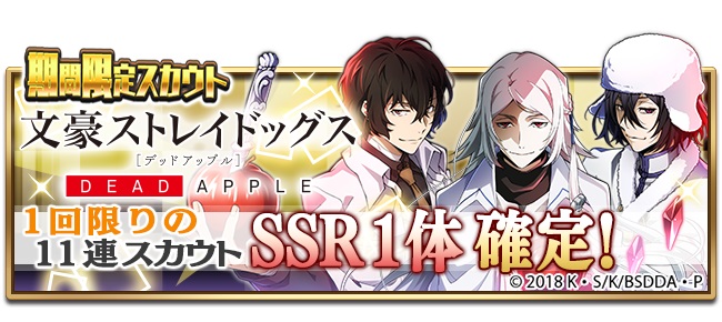 “映画『文豪ストレイドッグス DEAD APPLE』スカウト”には“SSR 【DEAD APPLE】太宰 治”、“SSR 【DEAD APPLE】 澁澤龍彦”、“SSR 【DEAD APPLE】フョードル・D”の3人が登場。描きおろしのゲームオリジナルイラストとなっている。