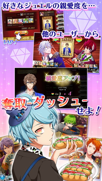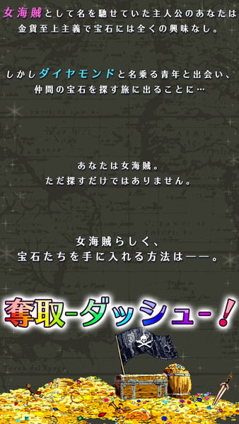 『ダッシュ!』は、宝石男子(ジュエル)たちの親愛度をめぐってプレイヤー同士で奪取(ダッシュ)しあうゲーム。主人公のアナタは女海賊となり“天真爛漫なダイヤモンド”、“超絶面倒くさがりのルビー”、“ダイヤモンドよりも有名になりたい野心家のサファイア”、 “運命を信じるエメラルド”……など、価値のある宝石たちを奪取する。
