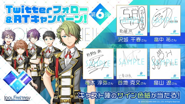 今回は“ALEX BOYS”のメンバーを演じる、沢城千春さん(影縫 照 役)、畠中 祐さん(朧夜呀狼 役)、榎木淳弥さん(熊野古満 役)谷地克文さん(乙骨祈夜 役)、畠山 遼さん(聖 剣志 役)のサイン色紙が抽選でプレゼントされる。詳細は“Twitterキャンペーン第6弾”特設ページにて。