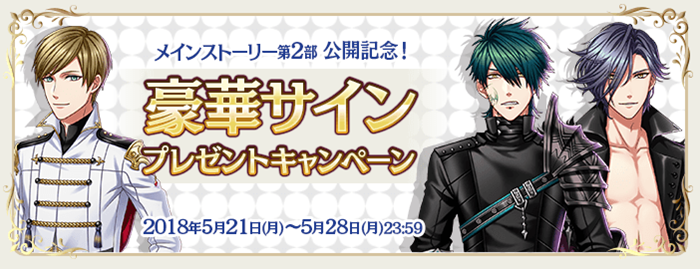 メインストーリー第2部に登場する新キャラクター発表を記念し、新キャラクターのキャラクターボイスを担当する声優陣3名のサインプレゼントキャンペーンが実施される。