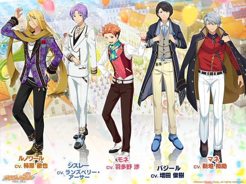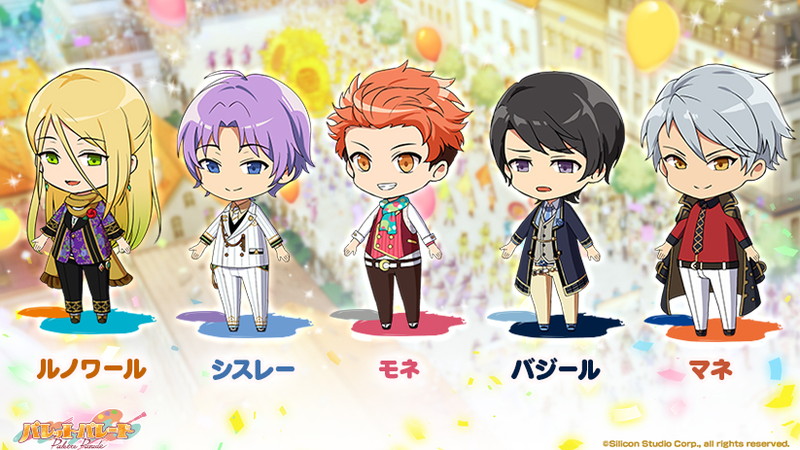 今回、“正装”姿が公開されたのは、ルノワール(CV.柿原徹也)、シスレー(CV.ランズベリー・アーサー)、モネ(CV.羽多野 渉)、バジール(CV.増田俊樹)、マネ(CV.新垣樽助)の5人。同時に、“正装”姿のSDキャラクターも公開された。